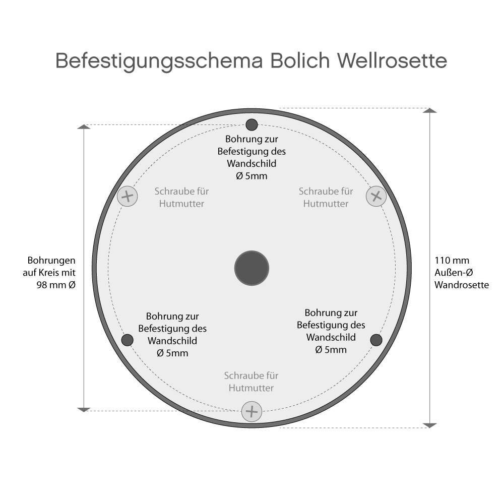 Inklusive gewellter Nostalgie-Rosette (Abb. 7, Ø 110 mm, Tiefe 33 mm) mit drei Kappenmuttern aus Messing, mit denen die Rosette an die mitgelieferte, verborgene Wandplatte befestigt wird. Somit ist eine leichte und schöne Wandmontage gewährleistet.