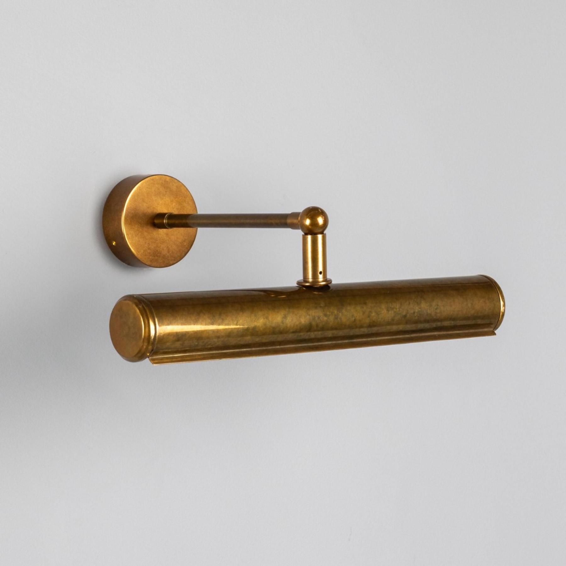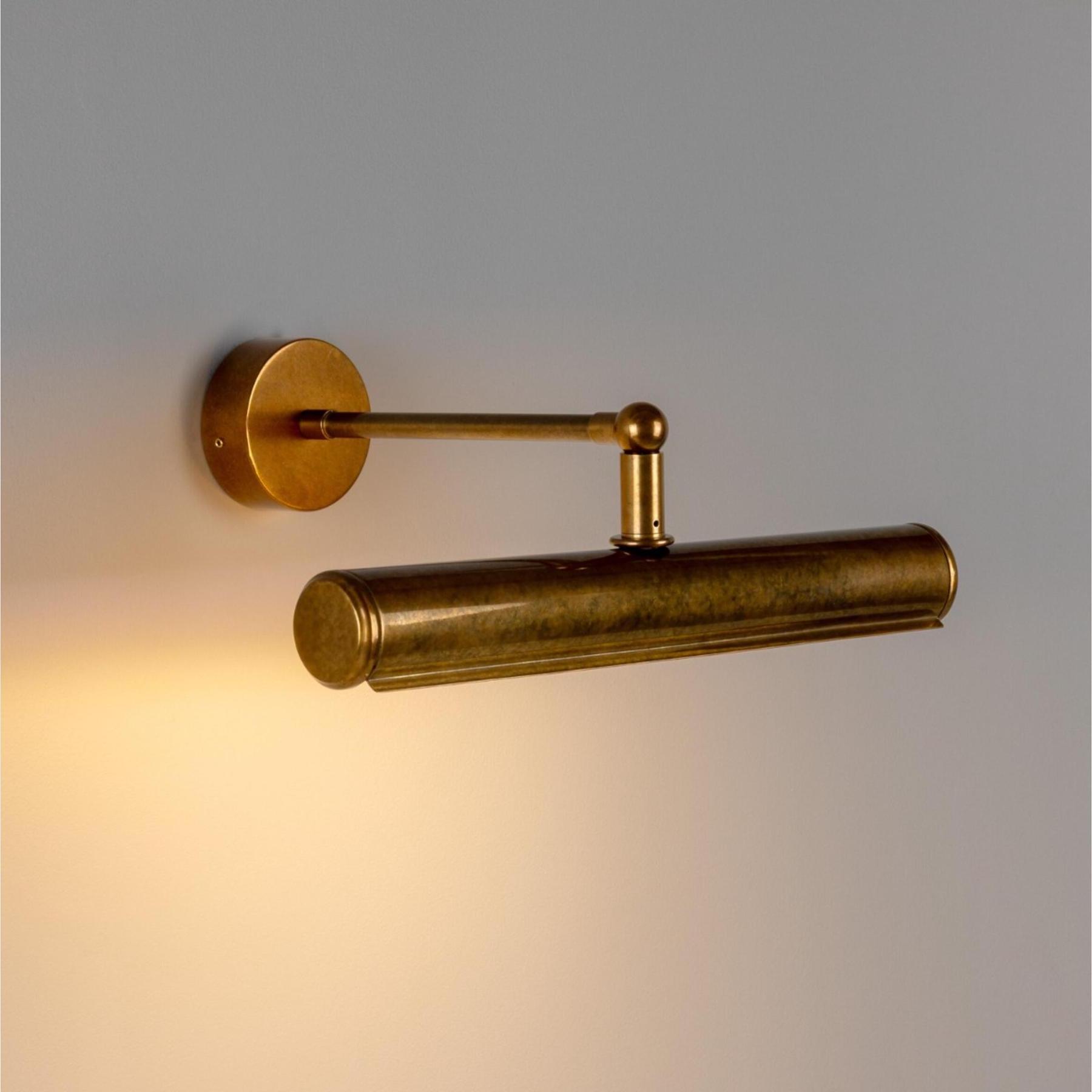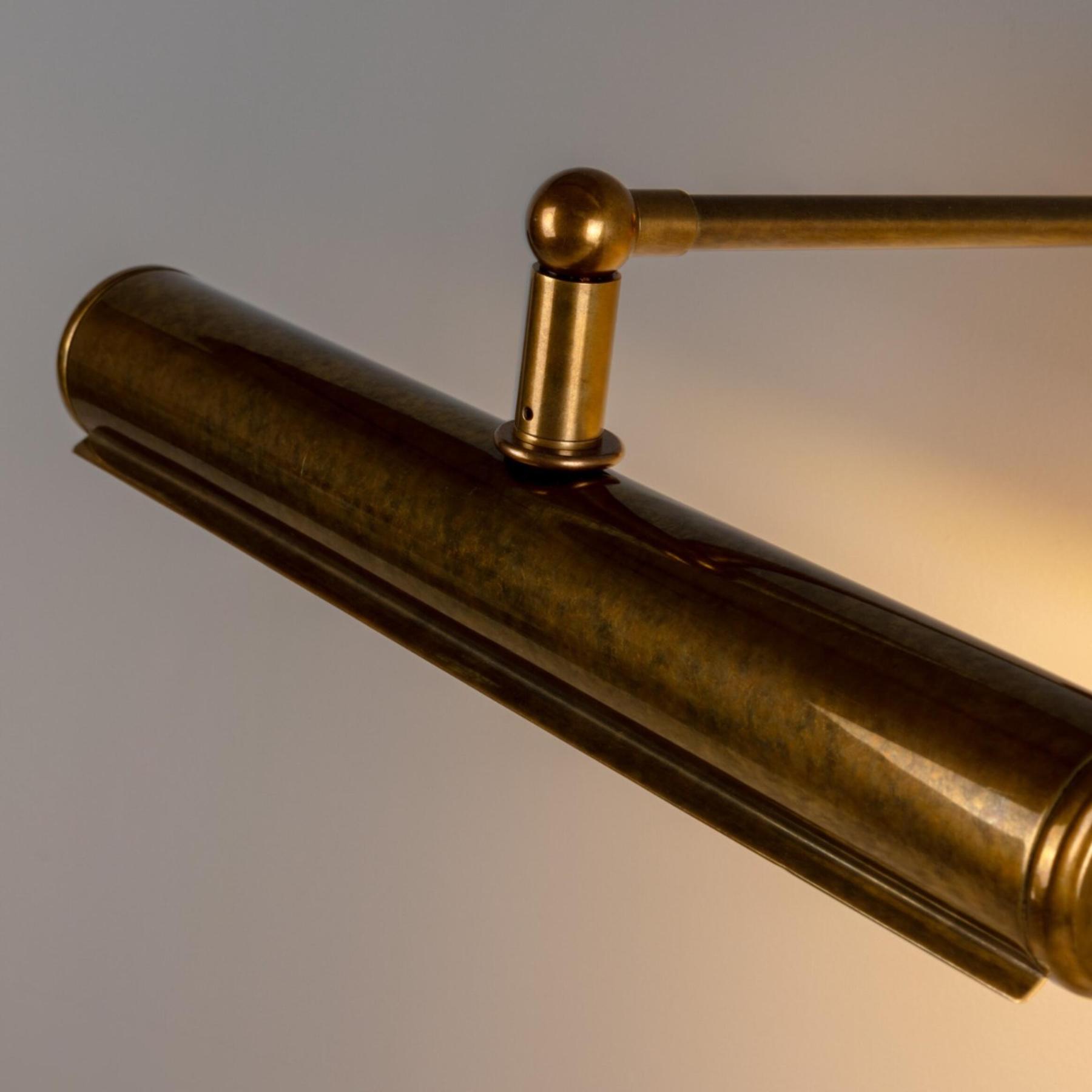 Durch die Kombination eines feststehenden Messingarms mit einem 35,5 cm langen Schirm wirft die Leuchte ein gleichmäßiges Licht auf Schilder, Speisekarten, Schaukästen oder andere Objekte.