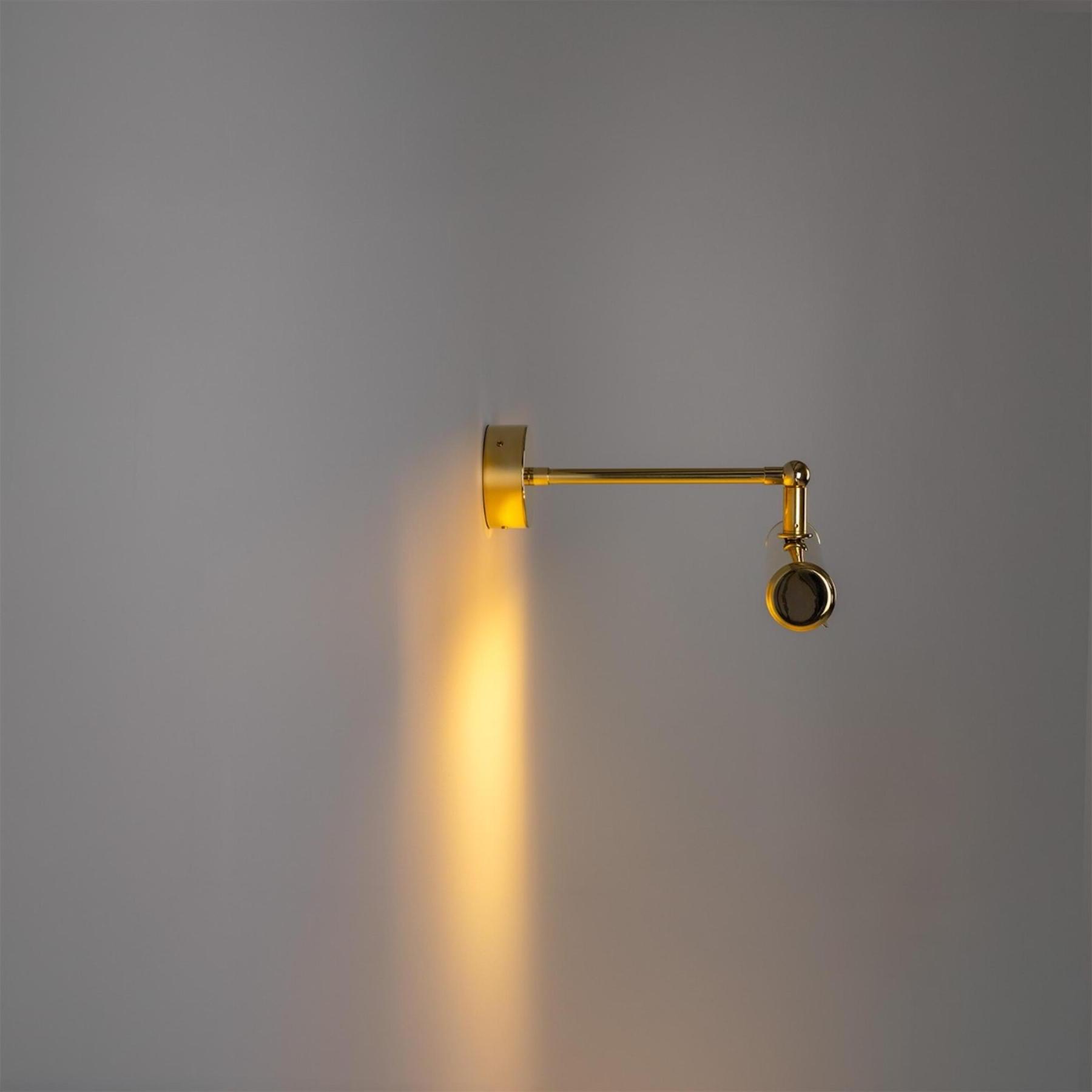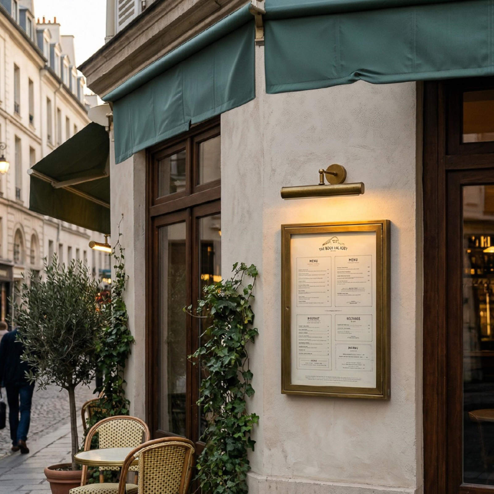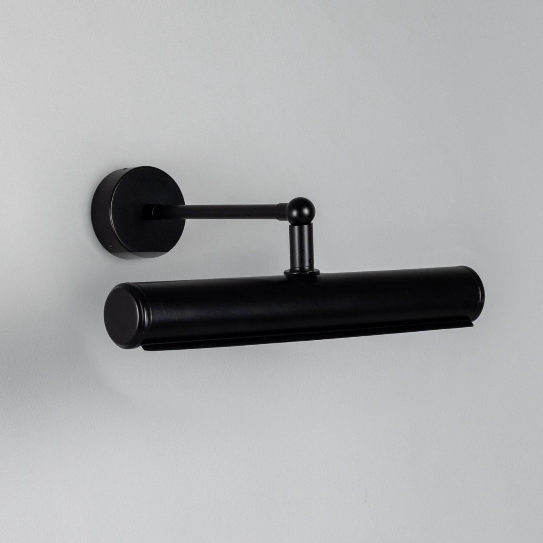 Durch die Kombination eines feststehenden Messingarms mit einem 35,5 cm langen Schirm wirft die Leuchte ein gleichmäßiges Licht auf Schilder, Speisekarten, Schaukästen oder andere Objekte.