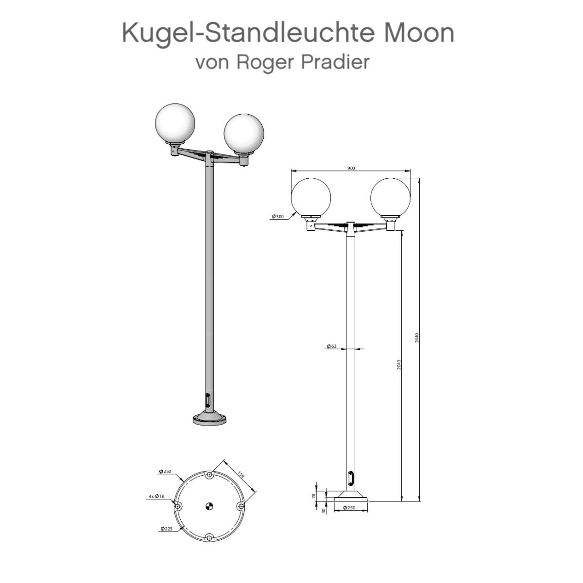 Zweiflammige Kugel-Standleuchte Moon: Diese französische Außenleuchte aus Aluminium mit 300 mm opalen Acrylglaskugeln ist als zweiflammiges Modell mit geradem Ausleger erhältlich. Die Mastleuchten sind in fünf verschiedenen Farblackierungen erhältlich.