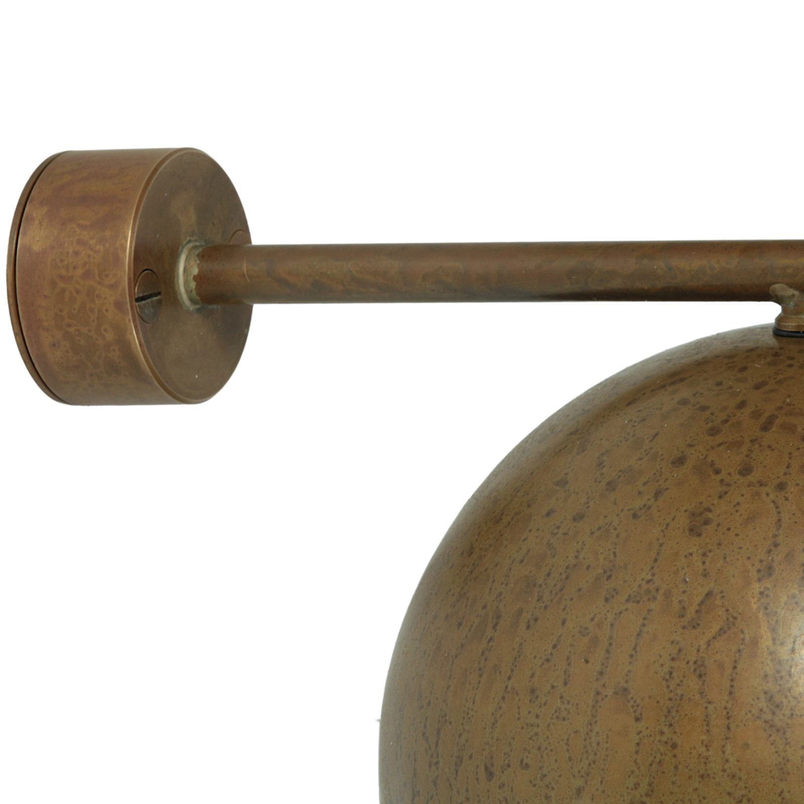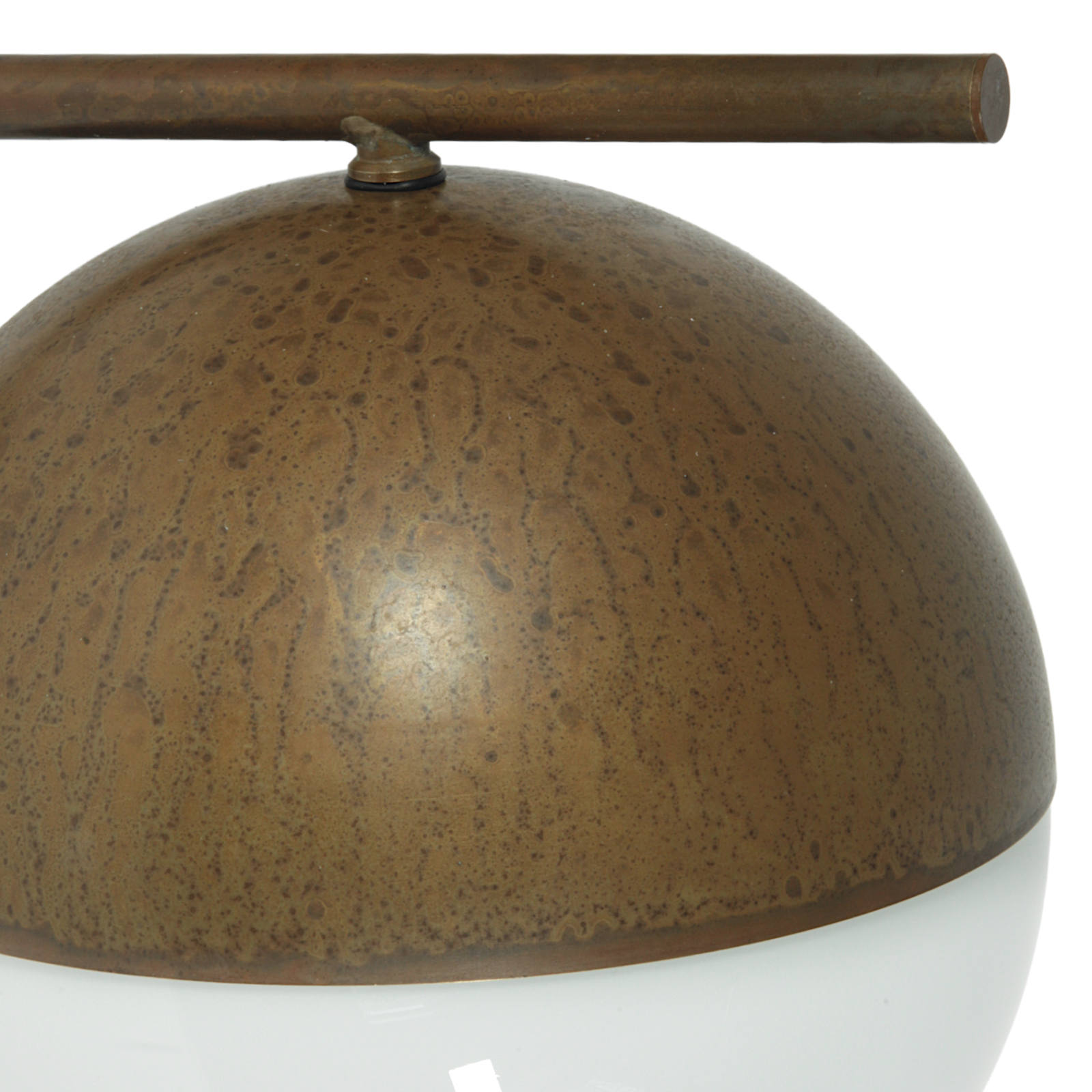 The brass parts of this spherical wall light are given a beautiful patina and enclose the hand-blown opal glass.