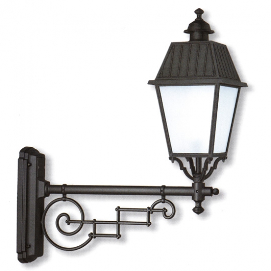 Large wall luminaire with historical bracket: Auraluce's wall lantern with closed, square roof is available upwards or downwards.