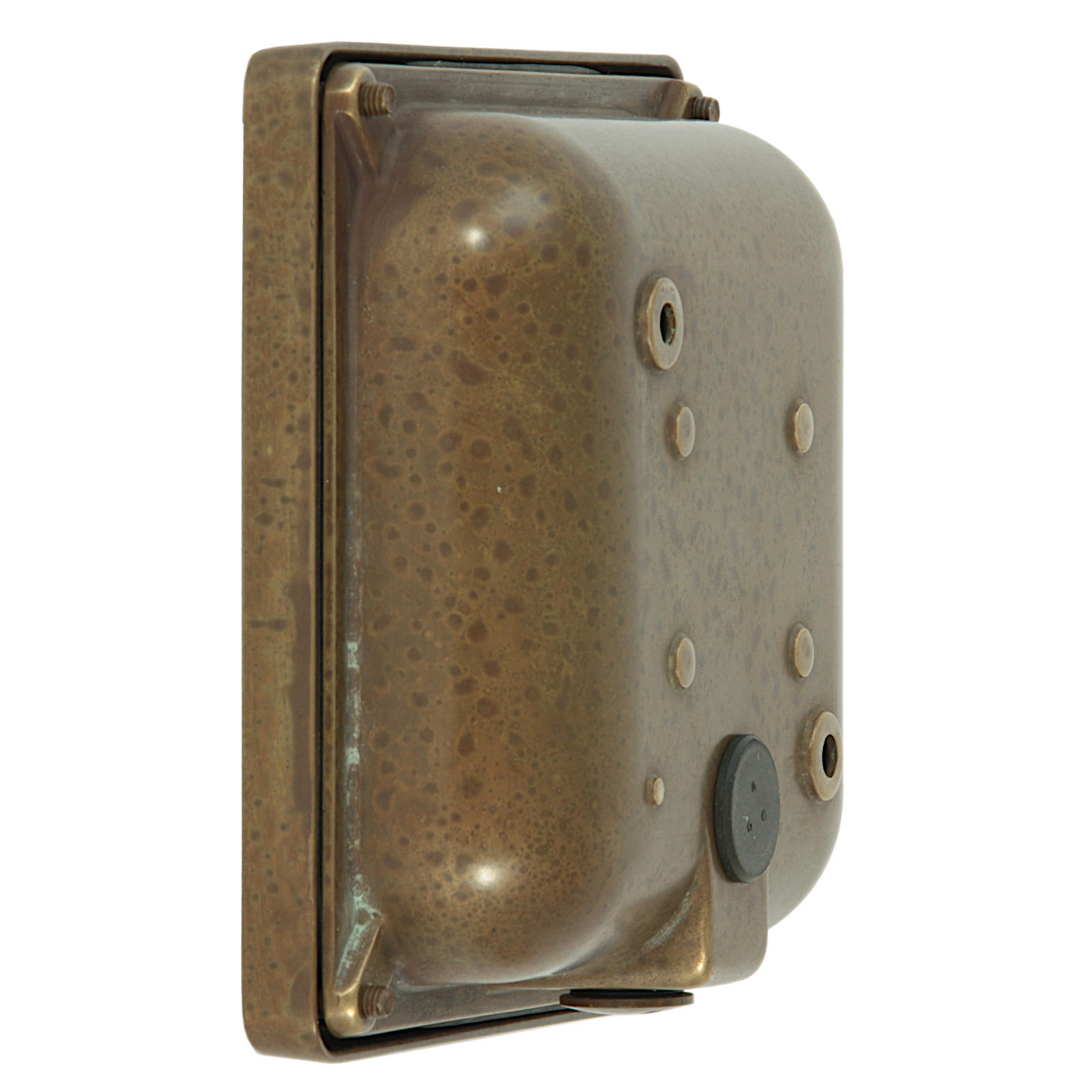 As most of the back is recessed into the wall, the only visible parts of the luminaire are the opal glass and the square frame made of authentically patinated brass.