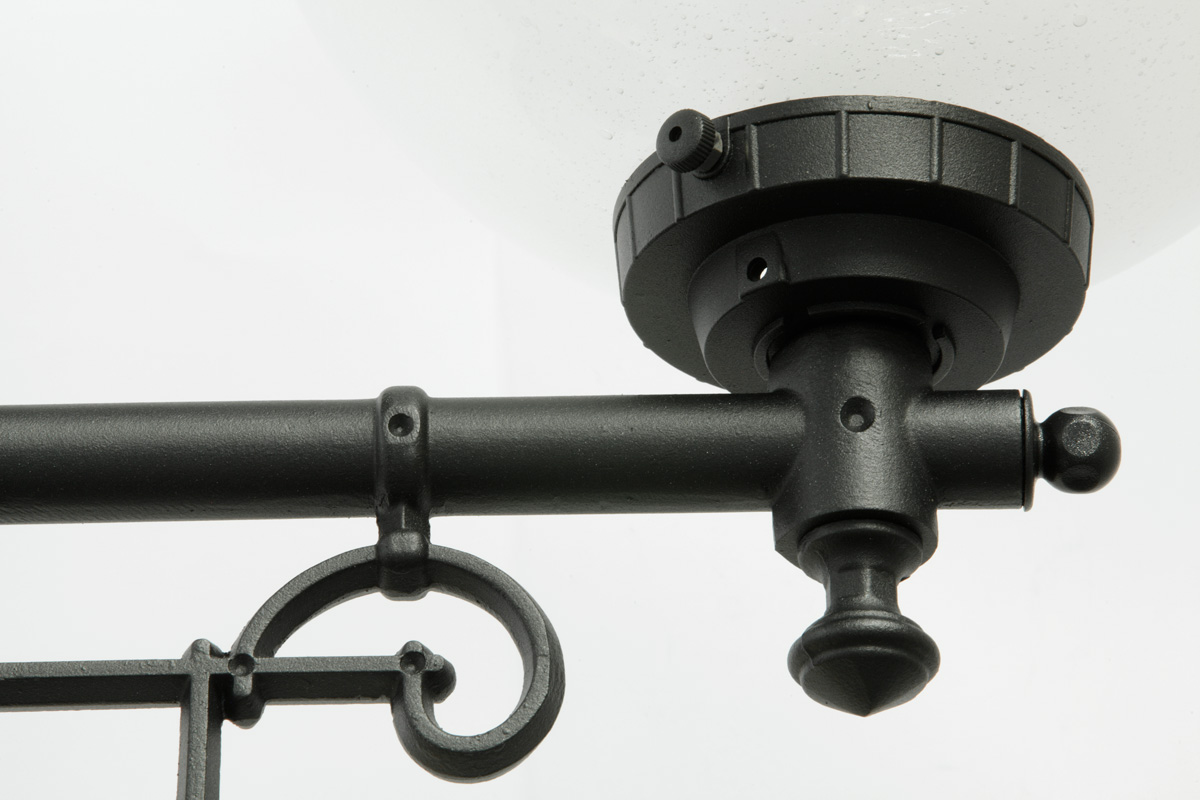 Auraluce's large historic 700 mm cantilever outdoor luminaire is available with 30 cm glass ball in clear or matt, up and down. The wall lamp is available in various standard colors.