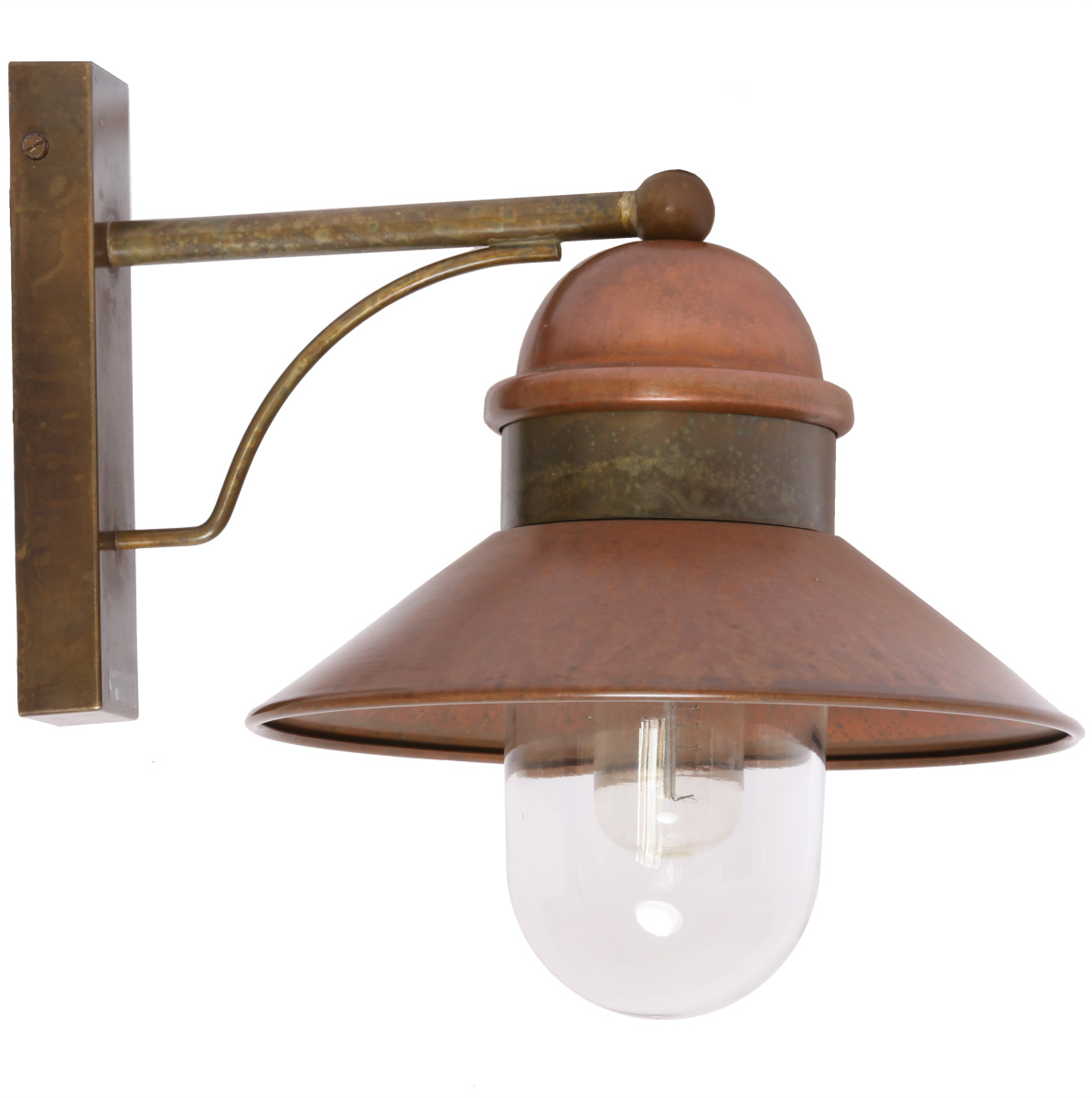This light with Mediterranean flair is manufactured to a high standard in every detail. The bell shade in the old factory style harmonises with the wall arm supported by a slender strut. The patinated brass and copper courtyard lights can be used universally for front doors and entrances as well as all paths and areas around the house.